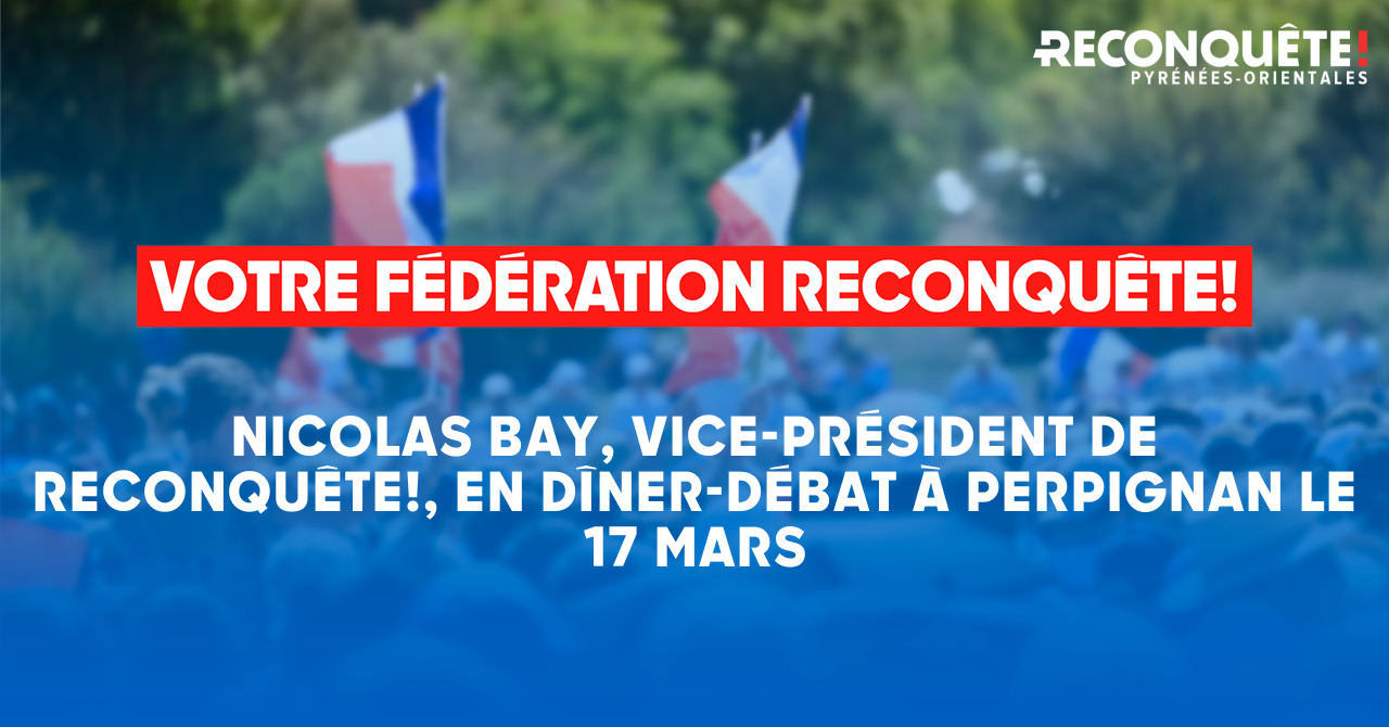 Notre vice-président exécutif, en charge des fédérations, Nicolas Bay, interviendra lors d'un dîner-débat à Perpignan, le 17 mars. Nicolas, actuel député européen, d'où ses visites récentes en Arménie, en Croatie et dans d'autres pays européens, a longtemps été l'un des responsables du Front National, et en a été secrétaire général. Nicolas Bay a ensuite décidé, comme Marion Maréchal, Stéphane Ravier, ou Guillaume Peltier, de soutenir Eric Zemmour en 2022.